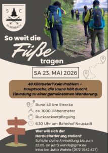 Liebe Mitglieder des SCB, wir laden euch herzlich ein zur gemeinsamen Wanderung „So weit die Füße tragen“ am Samstag, den 23. Mai 2026. 📍 Treffpunkt: 6:30 Uhr am Bahnhof Neustadt🥾 Strecke: ca. 40[...]